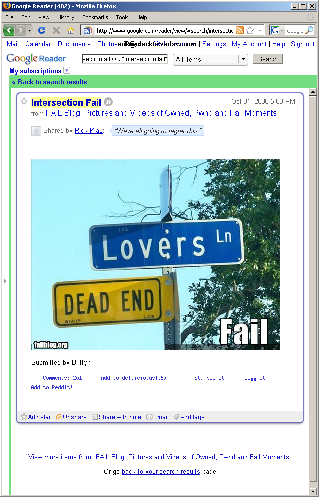 @rklau Thanks for the laugh re intersectionfail.com, http://is.gd/9iex, and recursive blogging, http://is.gd/9Yxx, hilarious!