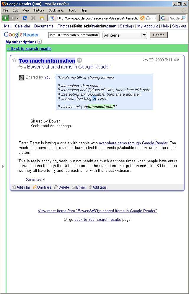 (Anyone pointing out that I am documenting this in a Google Reader shared item, which mirrors to FriendFeed, which then shows up on my blog and Facebook will be shot. Because that’s, like, totally different.)