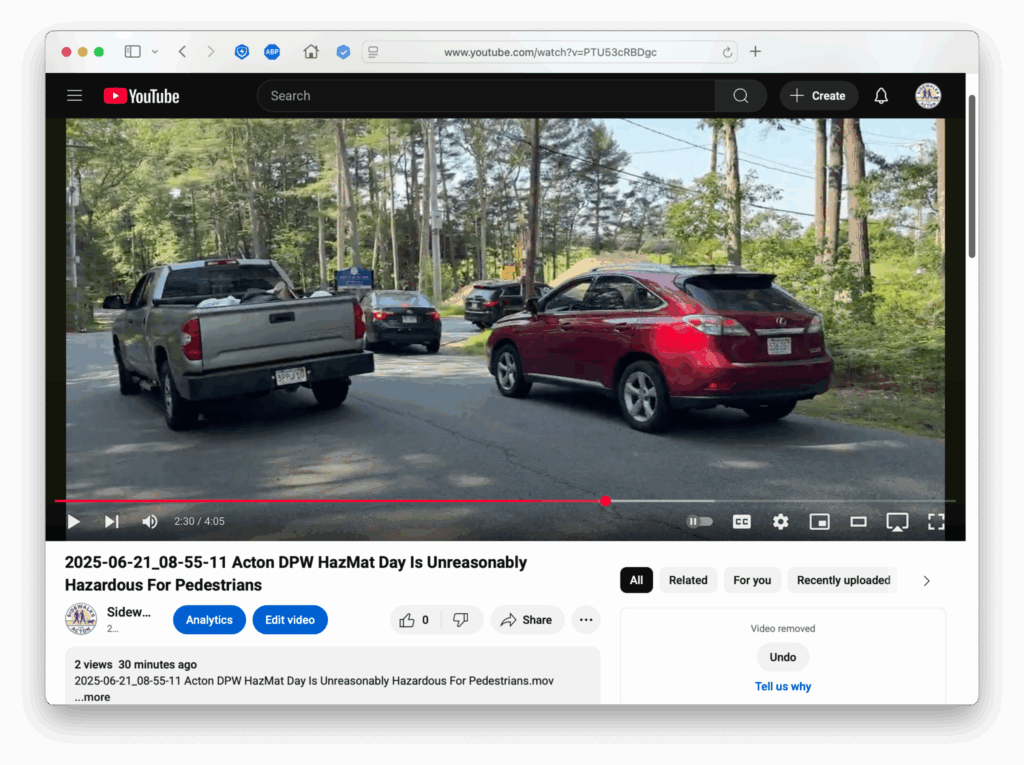 But during the June 21, 2025 DPW hazmat day, there was no police presence and no traffic control on Forest Road. Acton did nothing, ignoring the reasonable safety concerns of the Forest Road neighborhood. Nobody was directing traffic. Nobody was preventing cars from unreasonably endangering pedestrians.